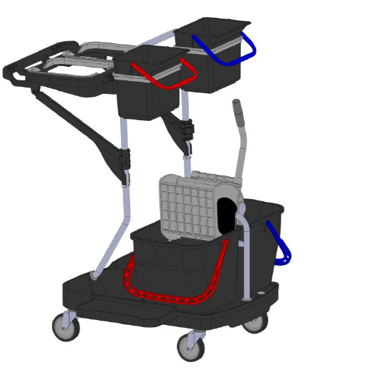 Chariot lavage ménage - Support sac 120L sans couvercle, 2 seaux 15L et presse mâchoires, 2 seaux 6L.